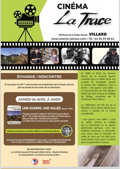 Ces deux séances sont réalisées en partenariat avec le comité du Souvenir Français Vallée Verte – Quatre Rivières dans le cadre du 80ème anniversaire de la libération de la Haute-Savoie par les seules forces unies de la résistance.