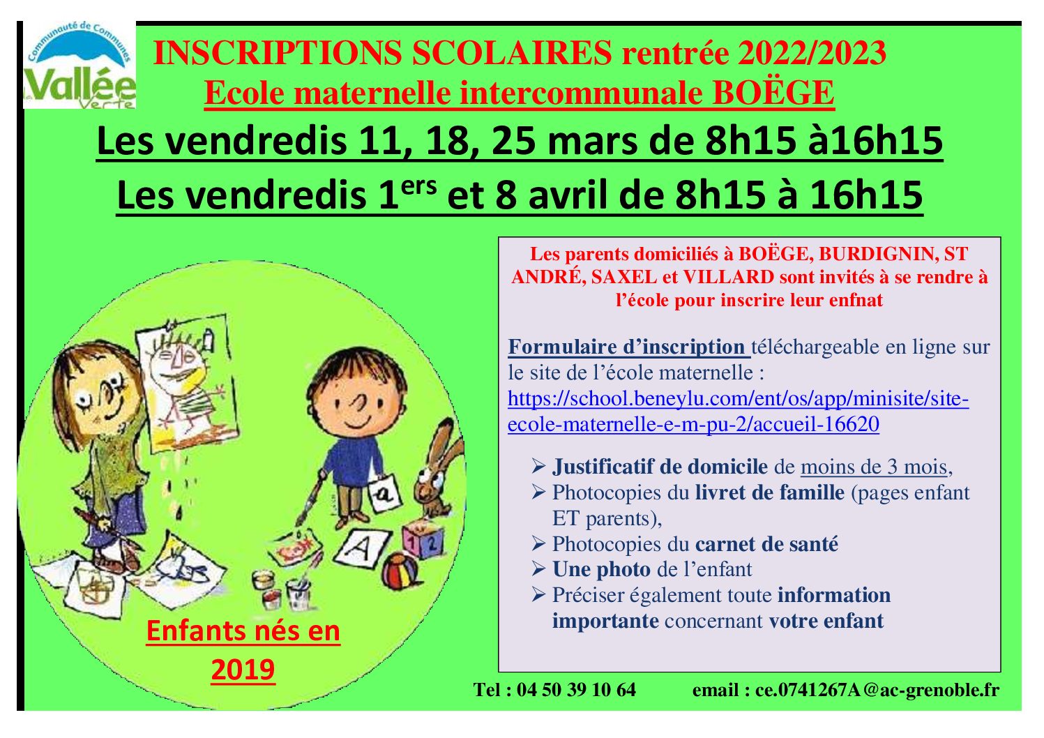 INSCRIPTIONS SCOLAIRES rentrée 2022/2023 Ecole maternelle intercommunale BOËGE